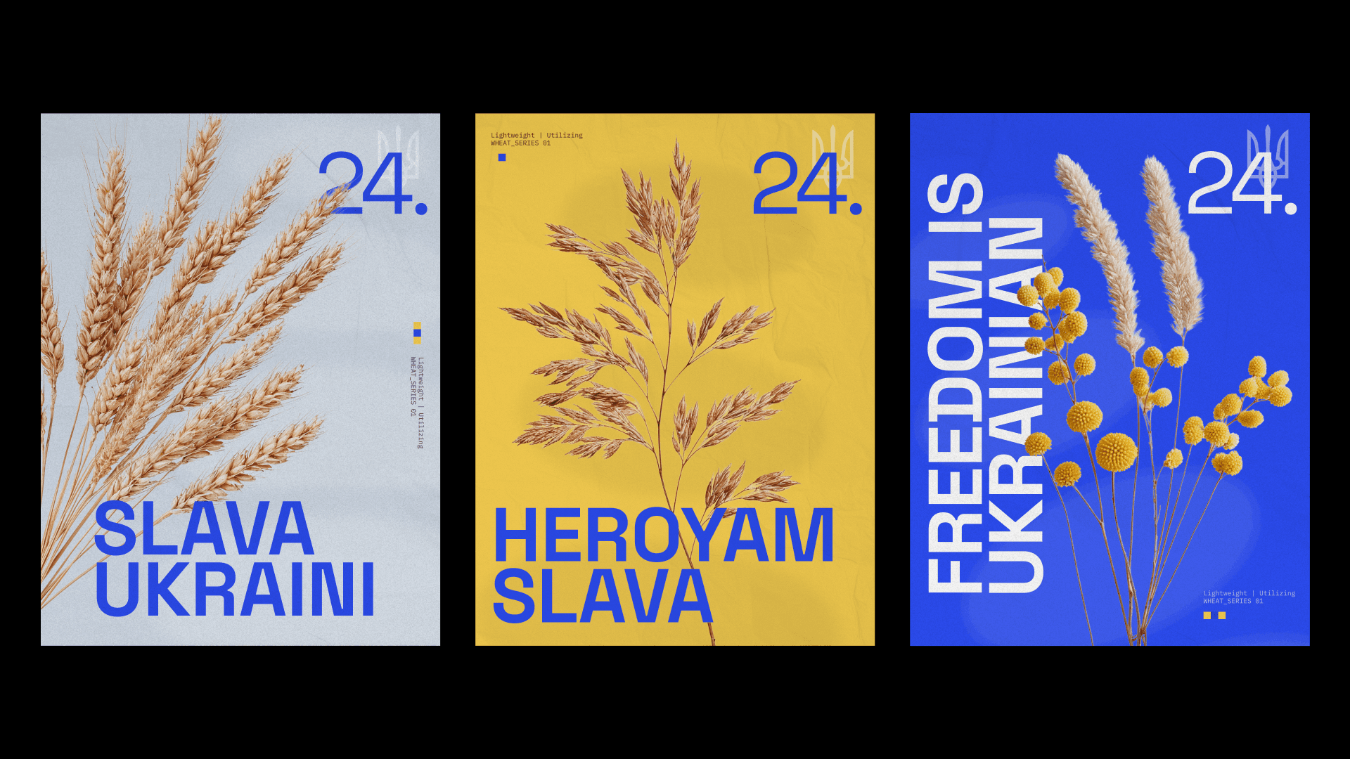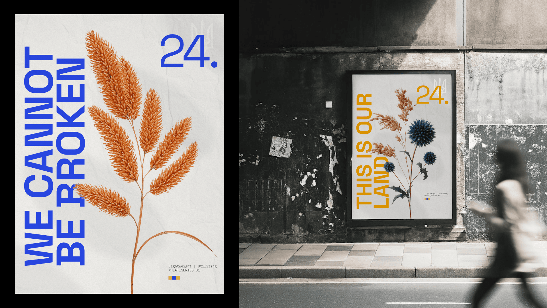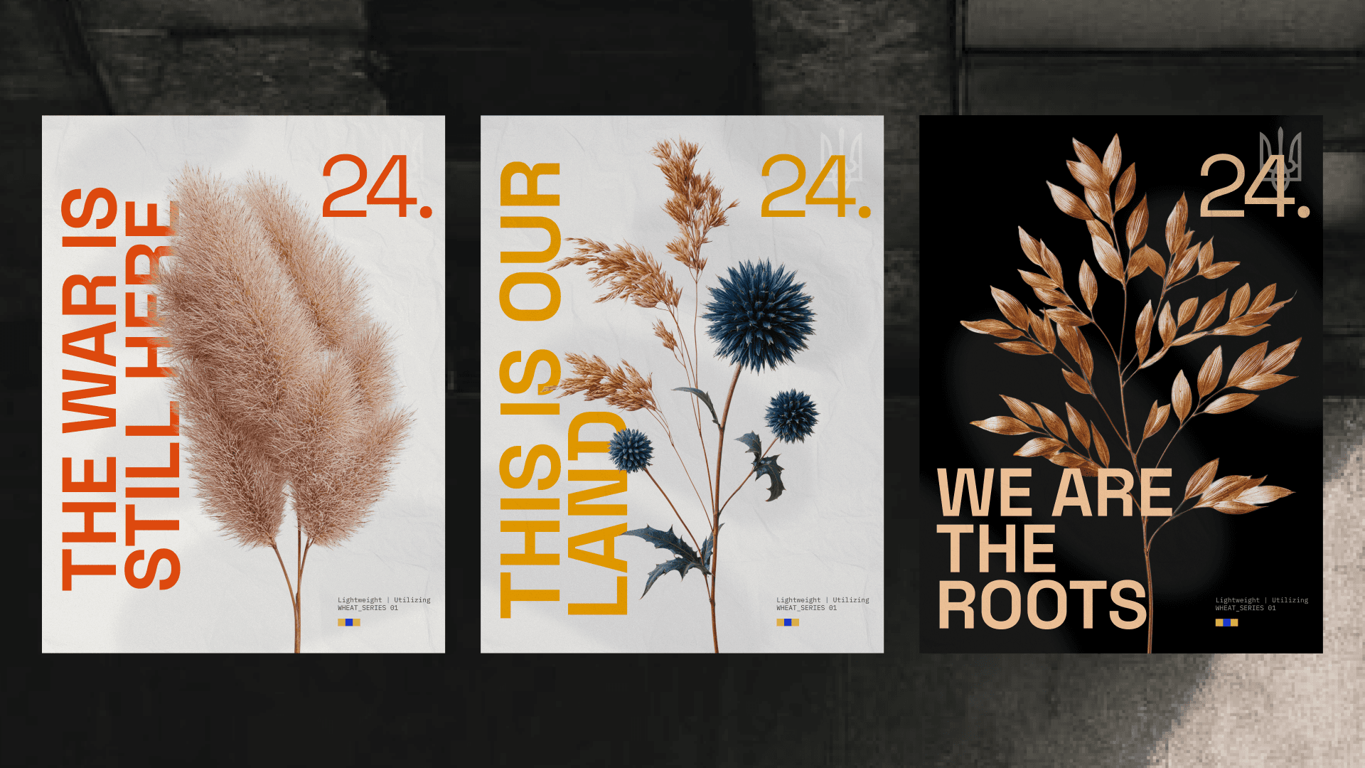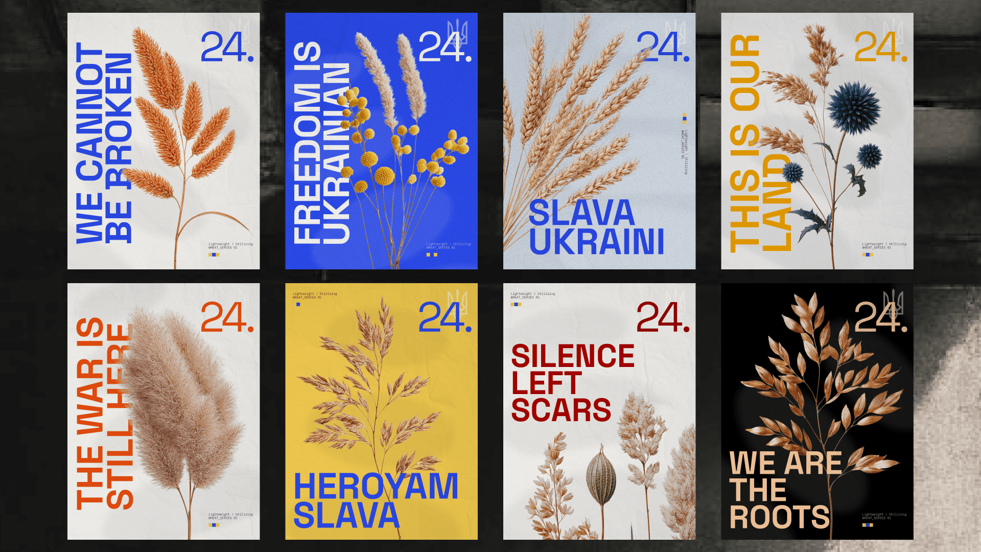 Each poster combines bold, brutalist typography with symbolic natural elements like dried wheat and flowers - simple, yet deeply rooted in Ukrainian identity. The repeated use of the number 24 marks the start of Russia’s full-scale invasion on February 24th, 2022 - a date that split time in two for millions of Ukrainians.
