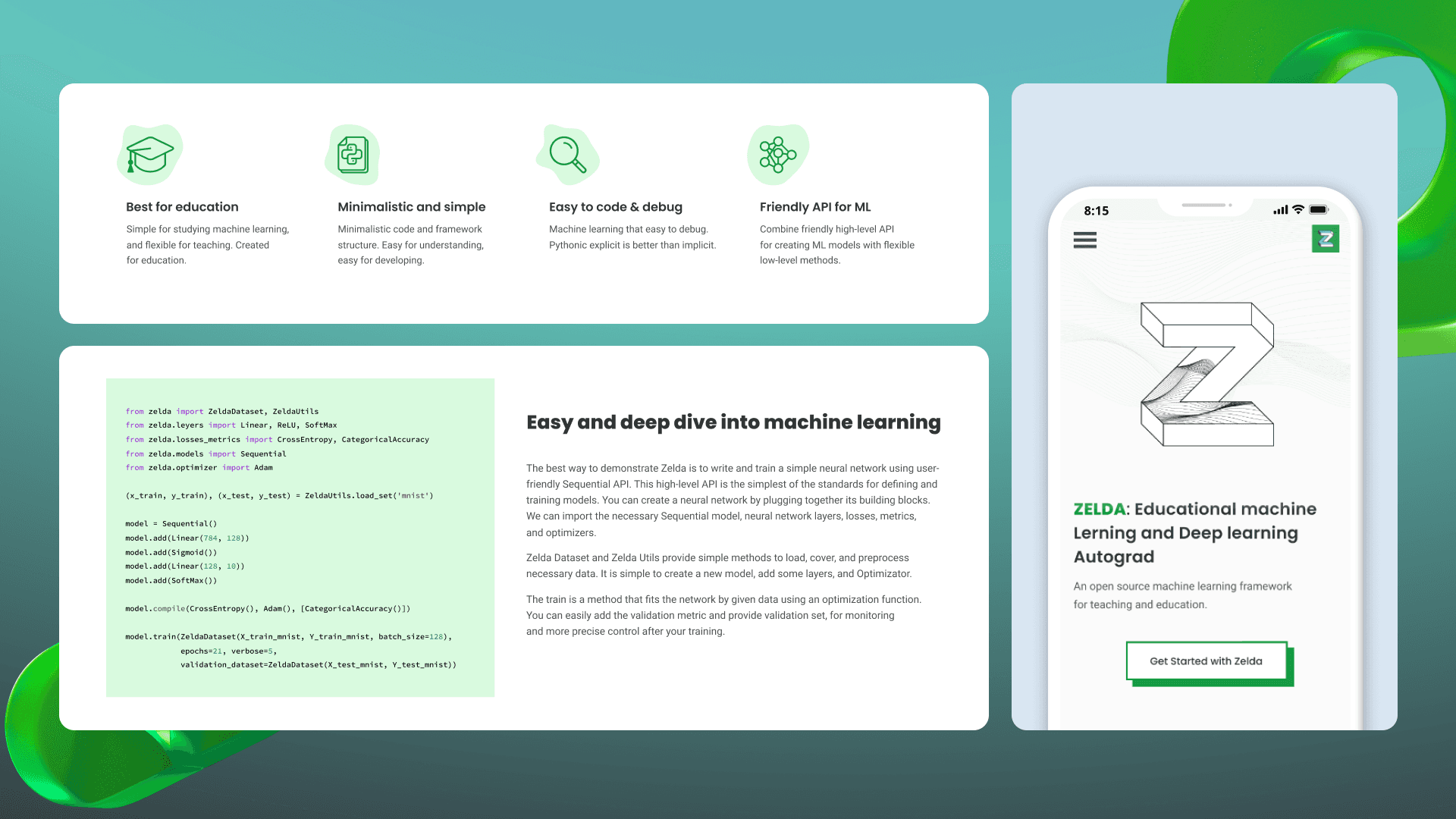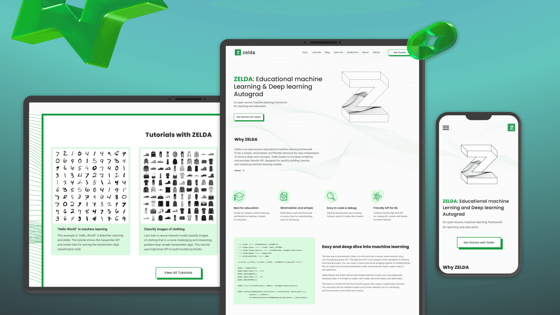 Zelda is an educational deep learning framework designed to make machine learning (ML) accessible to beginners and educators. I was responsible for designing and implementing an intuitive web platform using Tilda, creating a brand style, and developing custom illustrations that simplify technical concepts.